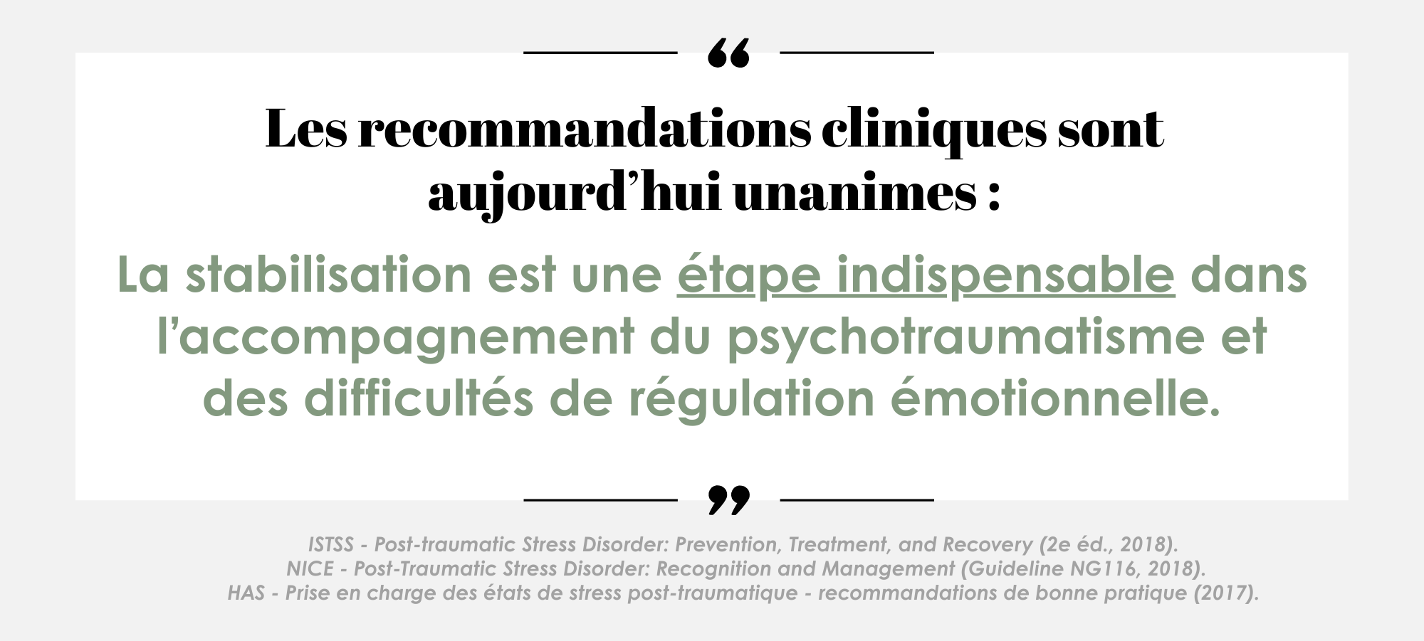 Même si vous n’êtes pas spécifiquement formé(e) au psychotraumatisme, la stabilisation ne concerne pas uniquement cette problématique. Elle est centrale dans de nombreuses situations : anxiété, attaques de panique, troubles de l’attachement, difficultés relationnelles, troubles de la personnalité… Dès qu’il y a dysrégulation émotionnelle, le travail de stabilisation devient pertinent.