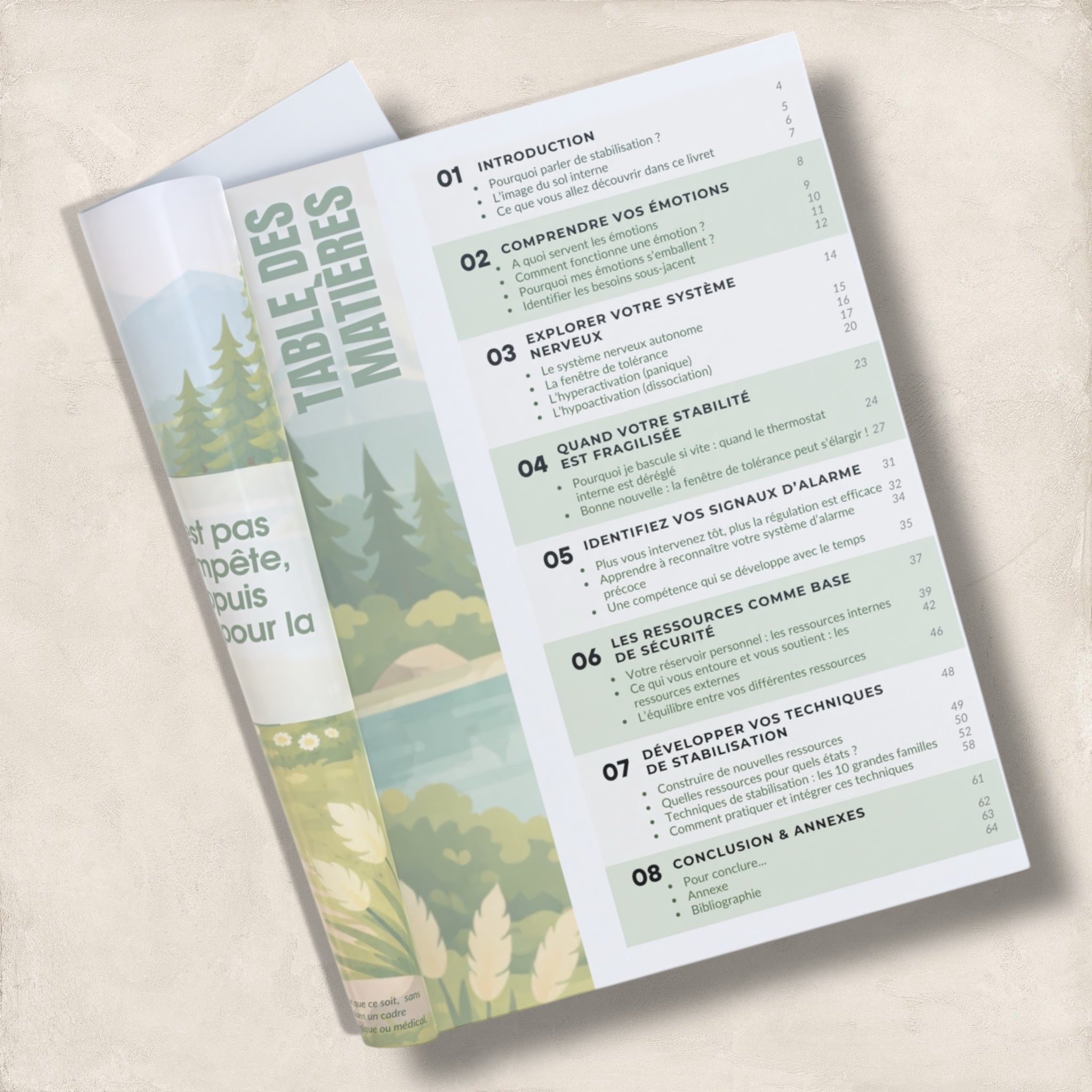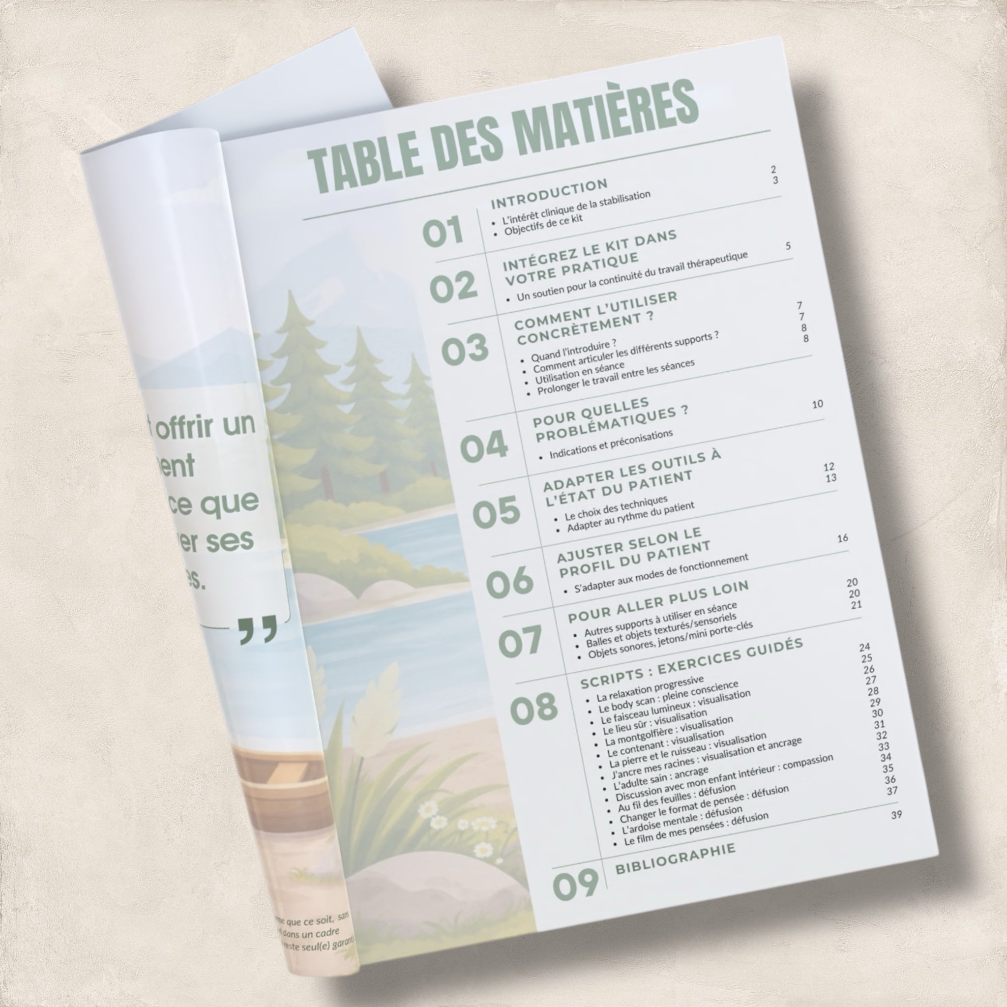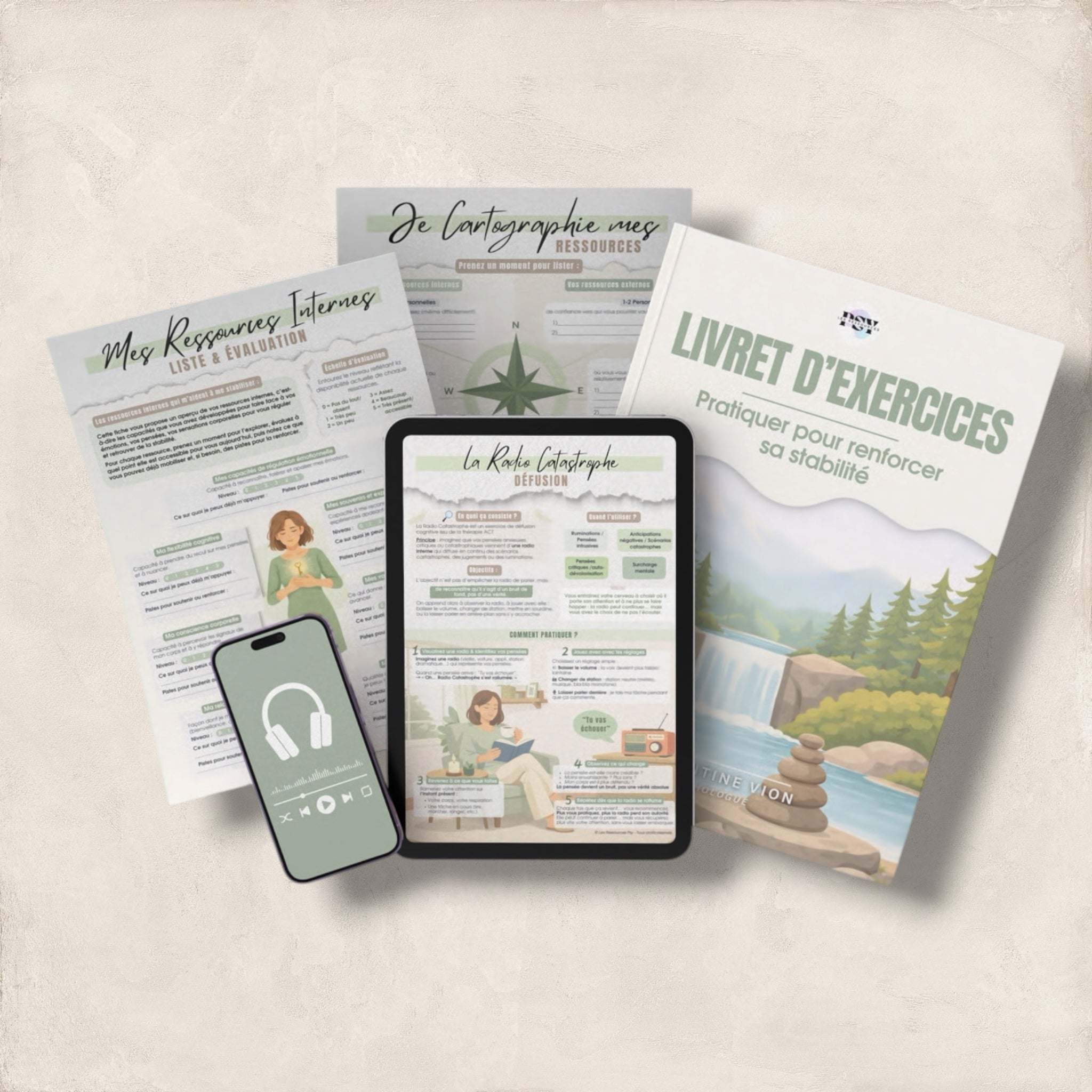 Ce kit ne se limite pas à une collection d’outils ou une liste de fiches mises bout à bout. Il a été pensé comme un ensemble structuré et cohérent, qui fait lien entre ce qui se travaille en séance… et ce qui se vit à l’extérieur pour renforcer et soutenir la phase de stabilisation.