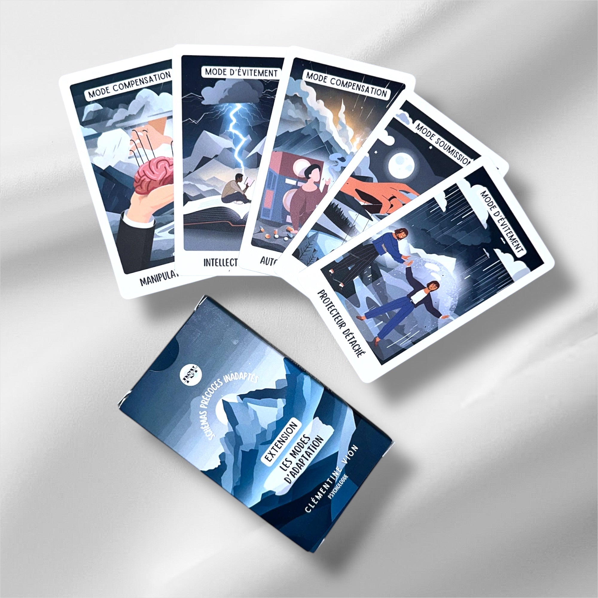 L'extension des modes d'adaptation permet, grâce à 21 cartes et 2 fiches PDF, de repérer avec précision les sous-types de modes d’adaptation comportementaux (soumission, évitement, compensation), souvent au cœur des blocages thérapeutiques. Elle offre aux patients une meilleure compréhension de leurs réactions automatiques et de leurs mécanismes de défense et favorise la prise de recul, pour sortir des fonctionnements répétitifs qui alimentent et renforcent les schémas précoces inadaptés.